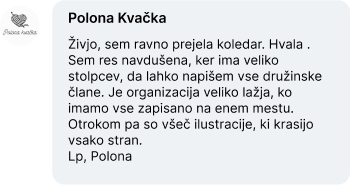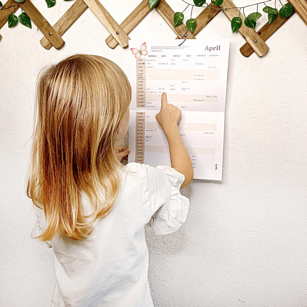 Družinski koledar jim pri tem pomaga na prijeten in vizualen način – s svojimi barvami, ilustracijami in pregledno razporeditvijo dni jih spodbuja, da sodelujejo pri načrtovanju družinskega vsakdana.