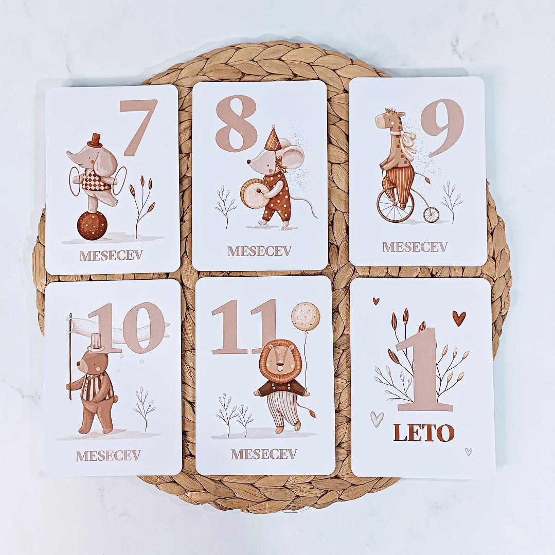 - Komplet 12 kartic: 1 mesec, 2 meseca, 3 mesece, 4 mesece, 5 mesecev, 6 mesecev, 7 mesecev, 8 mesecev, 9 mesecev, 10 mesecev, 11 mesecev, 1 leto